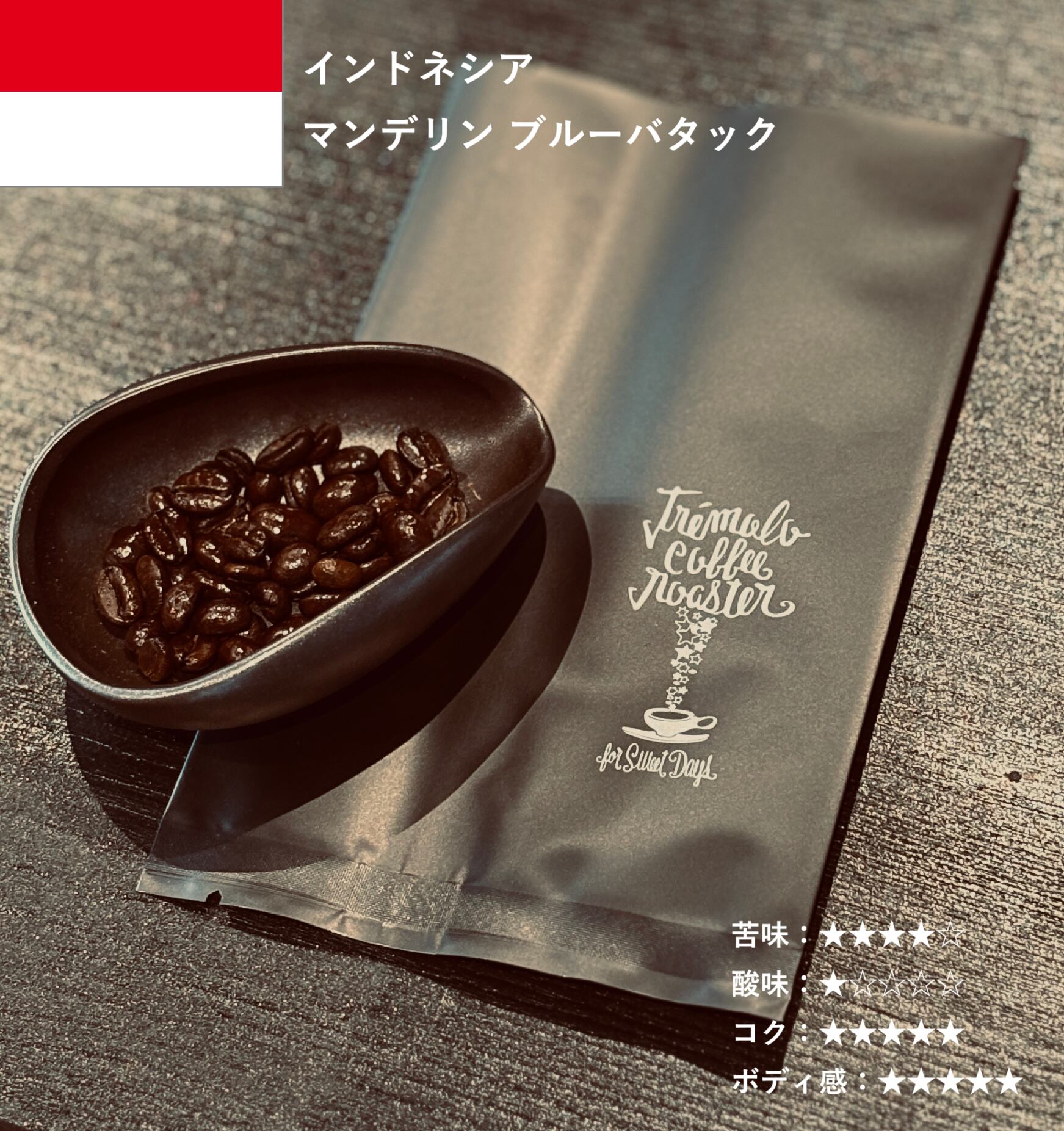 精製は、スマトラ独自の スマトラ式=ウェットハル(Giling Basah/ギリン・バサ)。高い含水率の状態で脱殻・乾燥を進めるこの手法により、青みを帯びたグリーン(ブルーがかった)外観と、マンデリン特有の重厚なボディが際立ちます。